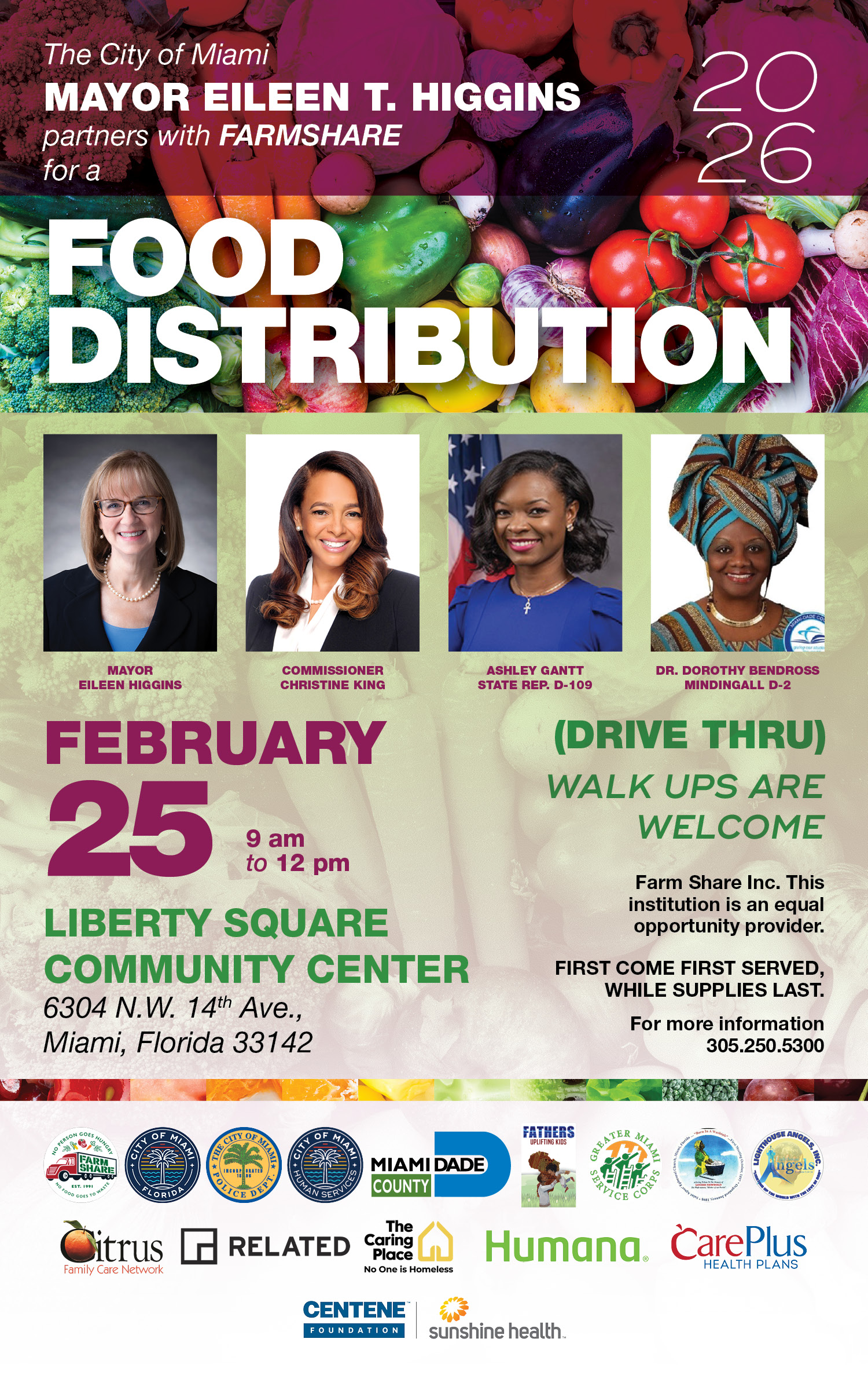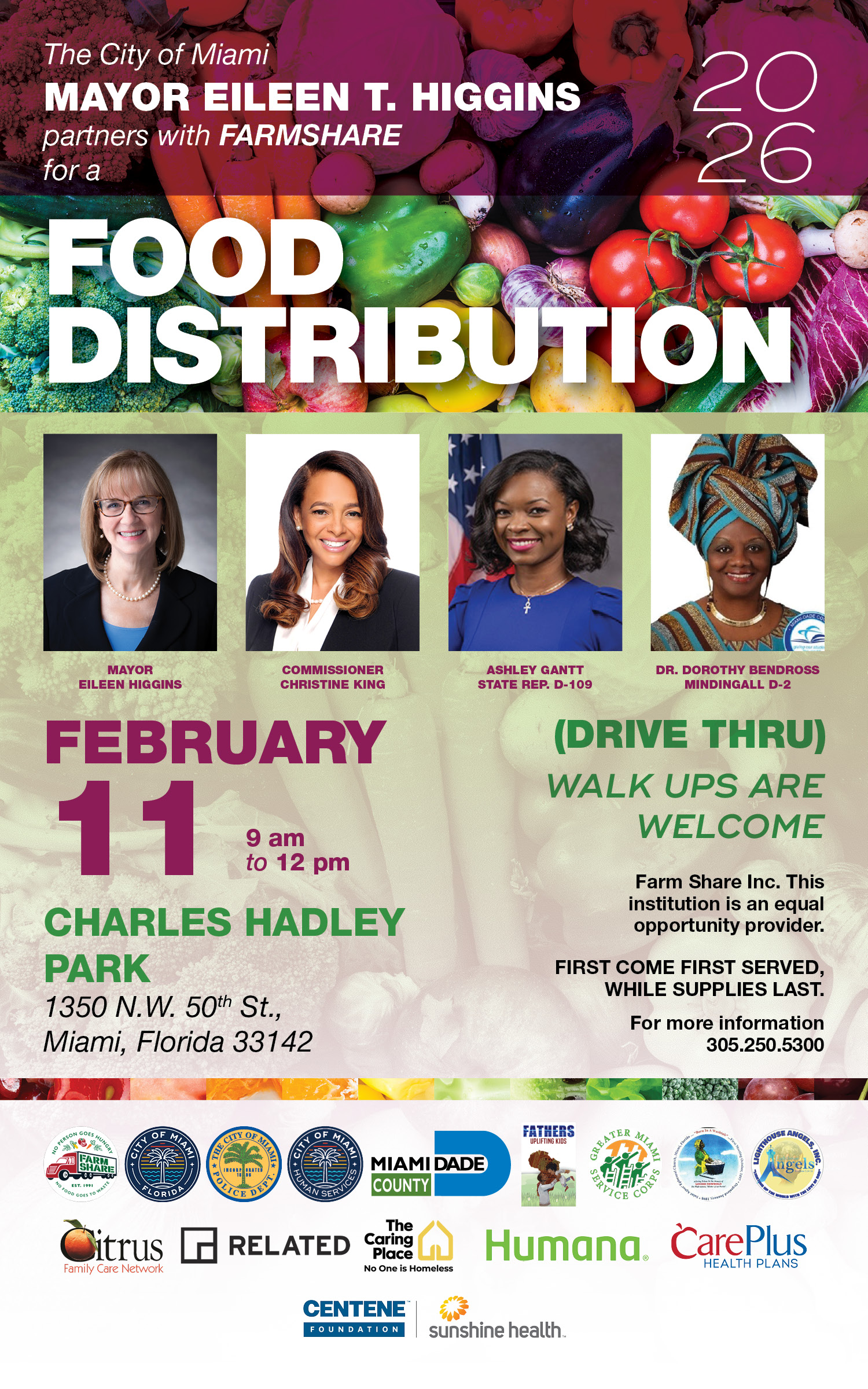 The City of Miami Mayor Eileen T. Higgins partners with FARMSHARE for a Food Distribution on February 11th, 2026 between 9:00am and 12:00pm.